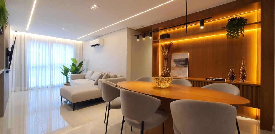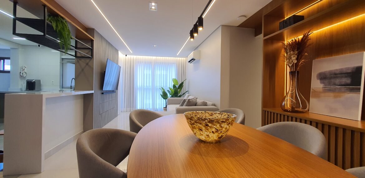 Mas as comodidades não param por aí. Todos os equipamentos, inclusive os interruptores, são inteligentes, permitindo que você ligue e desligue dispositivos à distância. Imagine chegar em casa com a temperatura perfeita, pois você pode ligar o ar-condicionado antes mesmo de entrar. Ou, verificar se todos os aparelhos estão desligados quando sair, garantindo economia de energia. O controle de todos os ambientes também é possível com o simples comando de voz, usando o assistente de sua preferência, como a Alexa, Google Home, Apple Home, entre outros.