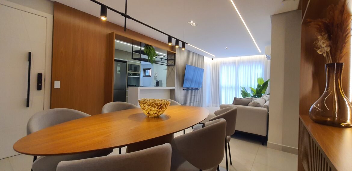 ✅ A sala de jantar possui uma elegante mesa com seis cadeiras em linho e um móvel embutido com um projeto de iluminação que cria um ambiente aconchegante e convidativo;