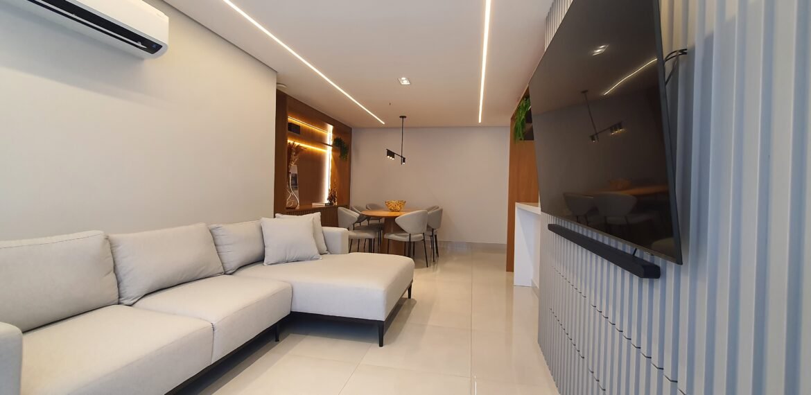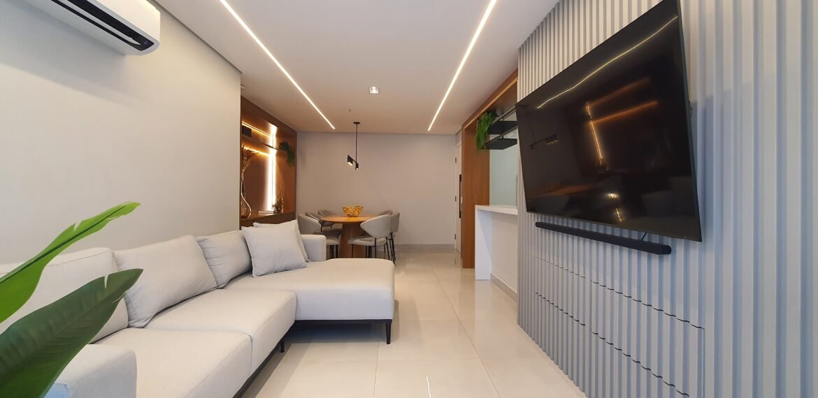 ✅ A sala é espaçosa, possui uma varanda com cortinas para proporcionar privacidade ou luminosidade conforme a preferência. O sofá de linho mede 2,80 metros, perfeito para acomodar amigos e familiares. A sala também está equipada com uma TV Samsung QLED 4K de 65 polegadas, um Soundbar Samsung S800 para uma experiência de áudio imersiva, ar condicionado de 12000 BTUs para manter o ambiente agradável e uma porta com fechadura eletrônica que pode ser aberta por meio de digital ou senha;