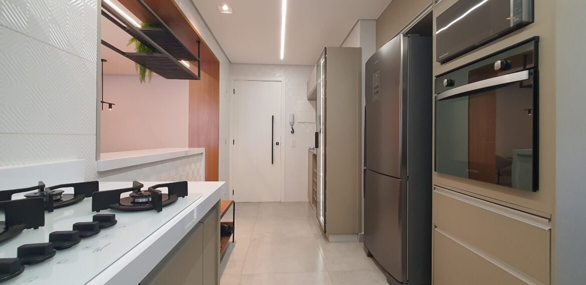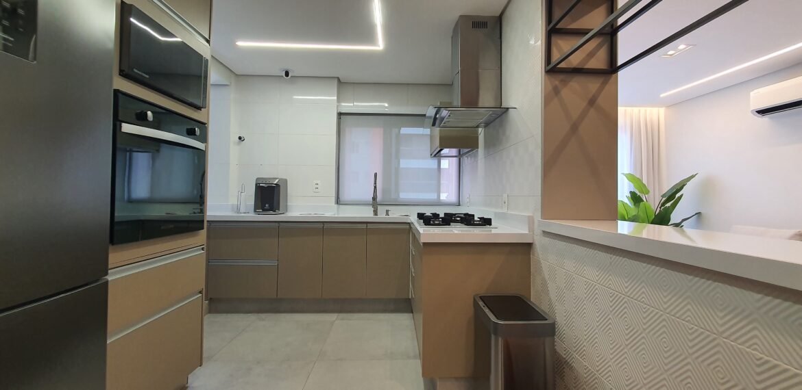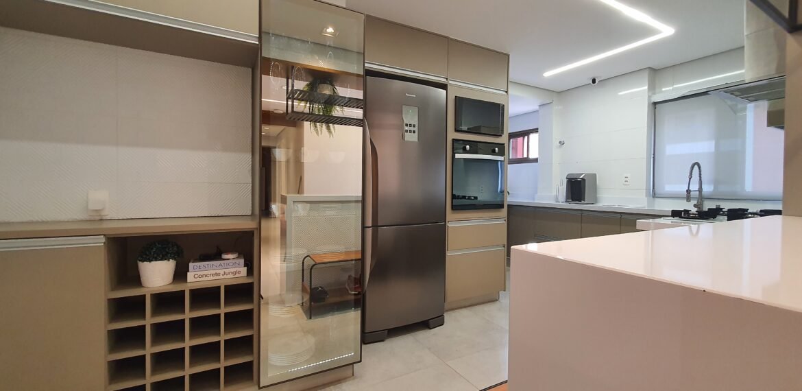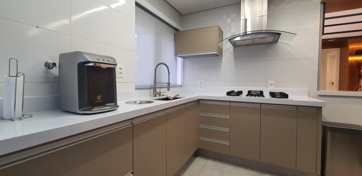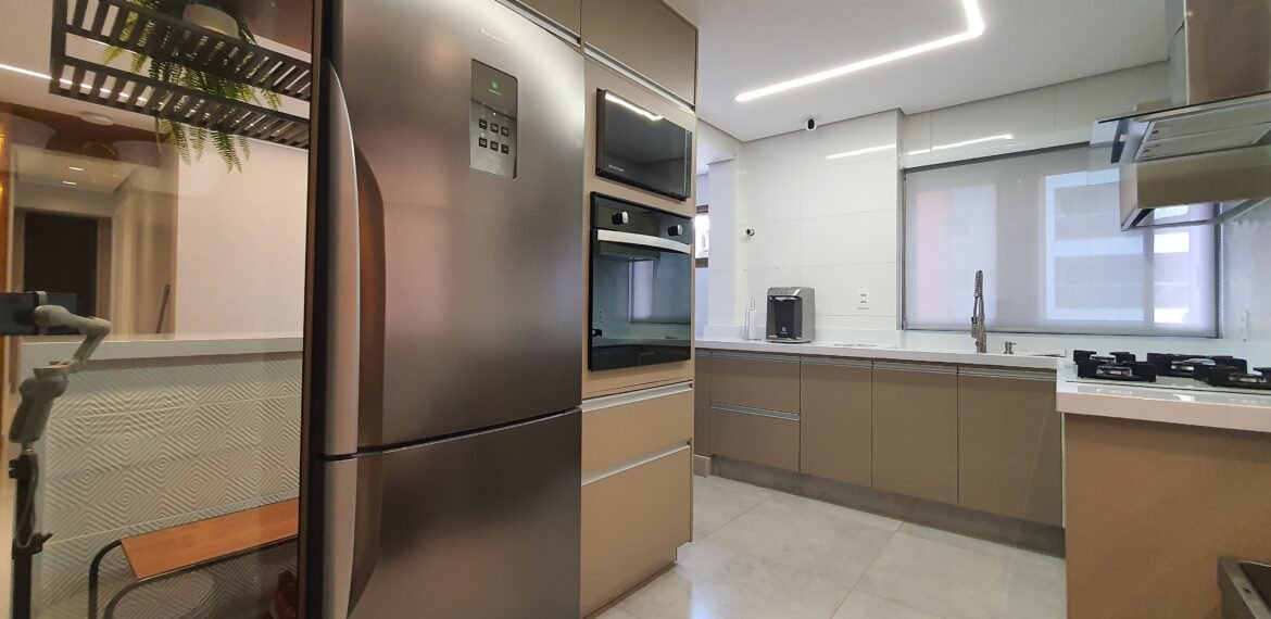 ✅ A cozinha é espaçosa e possui armários embutidos, cooktop, forno elétrico, micro-ondas, uma geladeira Panasonic Frost Free de 425 litros, uma cristaleira e um balcão que integra a sala. Além disso, há um purificador de água Eletrolux e uma lixeira com abertura sem toque para maior comodidade;
