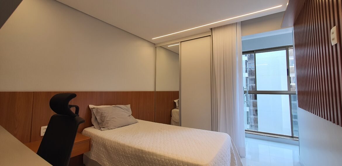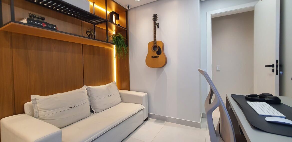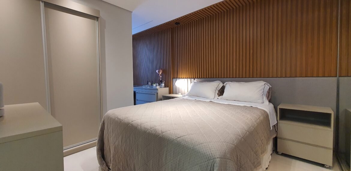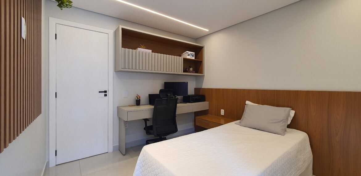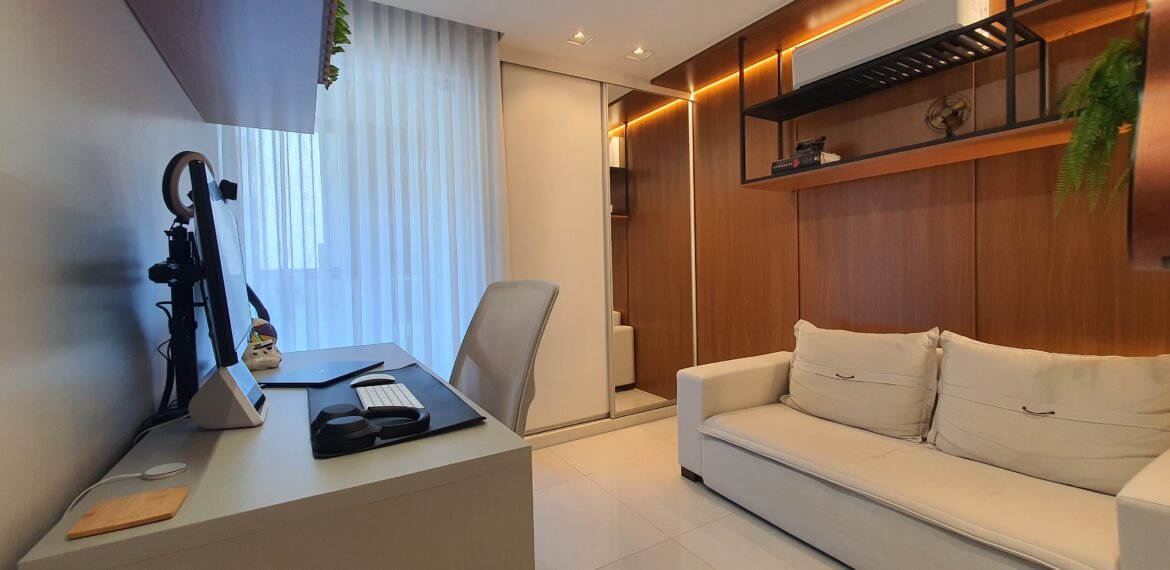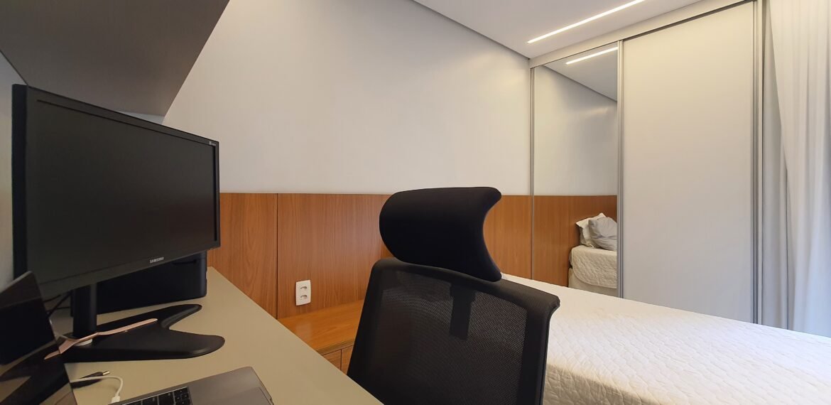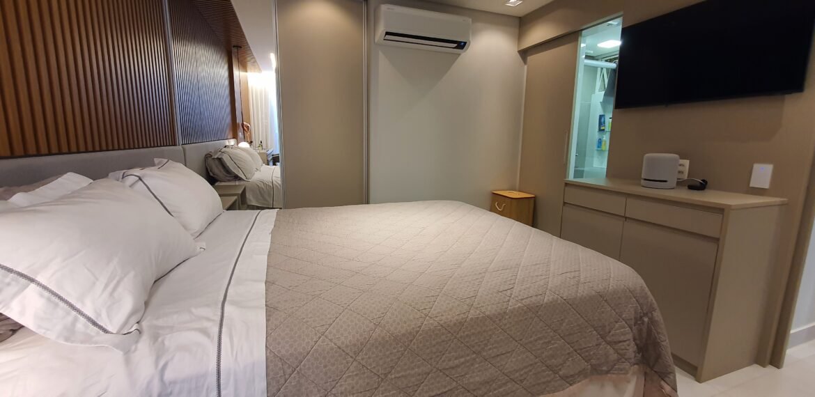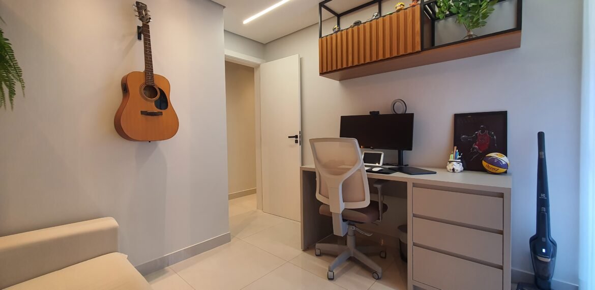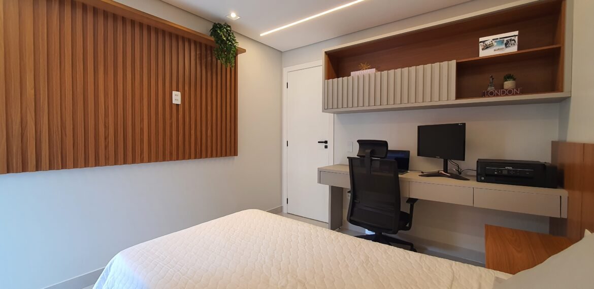 ✅ O apartamento conta com três quartos, todos com guarda-roupa embutido que aproveita o espaço de piso a teto. Um deles é uma Suíte Master, com banheiro privativo equipado com armários, blindex e chuveiro. A suíte também possui uma cama queen, cabeceira, cadeira de design, criados-mudos, uma TV Samsung Neo QLED de 43 polegadas e ar condicionado. Outro quarto foi transformado em um espaço de escritório, com móveis de escritório, uma cadeira de escritório e uma cama para hóspedes. O terceiro quarto também serve como escritório e inclui um sofá de linho de 1,80 metro, decoração, prateleiras e ar condicionado;