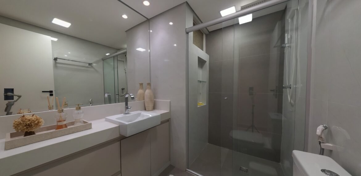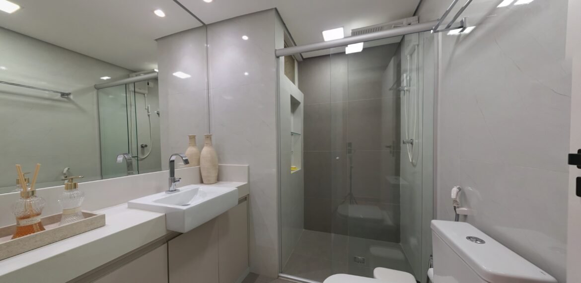 ✅ O banheiro social é bem equipado, com armários e blindex;
